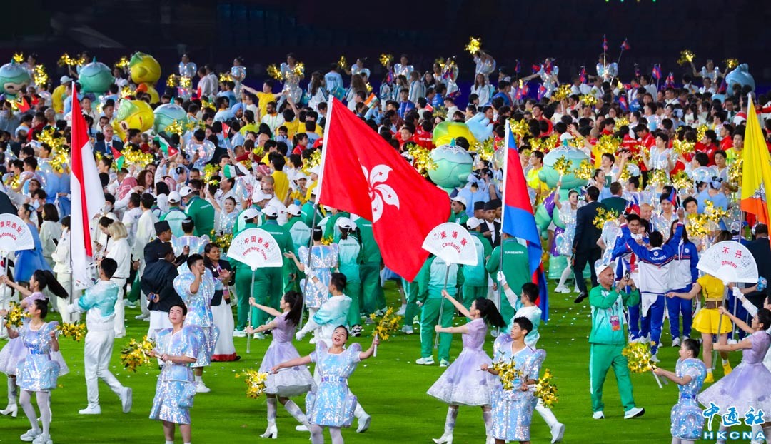10月8日晚,杭州第19屆亞運會閉幕式在杭州奧體中心體育場舉行。圖為中國香港體育代表團旗幟入場。(香港中通社記者 洪少葵攝)