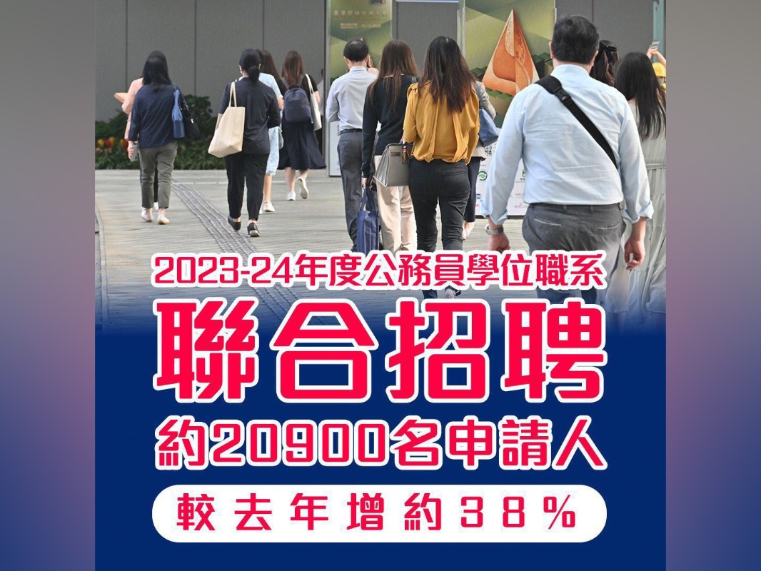 香港新聞網10月12日電 2023-24年度聯合招聘政務主任、二級行政主任等6個公務員學位職系上周五(6日)截止申請,公務員事務局收到約20900人經網上報名,較去年增加約38%。
