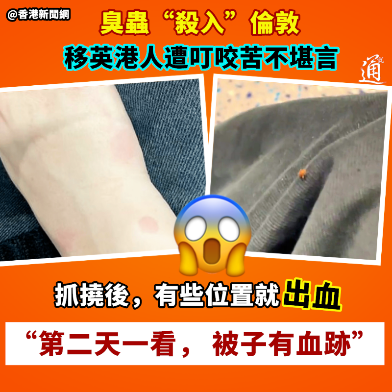 臭蟲“殺入”倫敦,移英港人遭叮咬苦不堪言香港新聞網10月18日電 移英港人沒料到,除要應對英國的通貨膨脹、罷工外,還要遭遇“臭蟲危機”…… 近期,法國巴黎臭蟲(又名床虱)肆虐,英國亦未能倖免。有移英港人近日訴苦,遭臭蟲叮咬,瘙癢難耐,睡眠亦受影響。 據網媒報道,移英港人Alfred是英國倫敦一家中餐廳的經理,每日都會搭乘倫敦地鐵北線通勤。 Alfred稱,近日手肘皮膚出現幾處紅點,起初,他以為是皮膚敏感,不以為意。豈料,第二天狀況加劇,被叮咬的位置開始痕癢難耐,部分位置出現紅腫及水泡,細看下更發現,咬痕原來蔓延至頸部和大腿。Alfred形容,被臭蟲叮咬後睡眠質素受到影響,因為睡覺時也會癢到想抓撓,可抓撓後,有些位置就出血,“第二天一看,被子有血跡。”