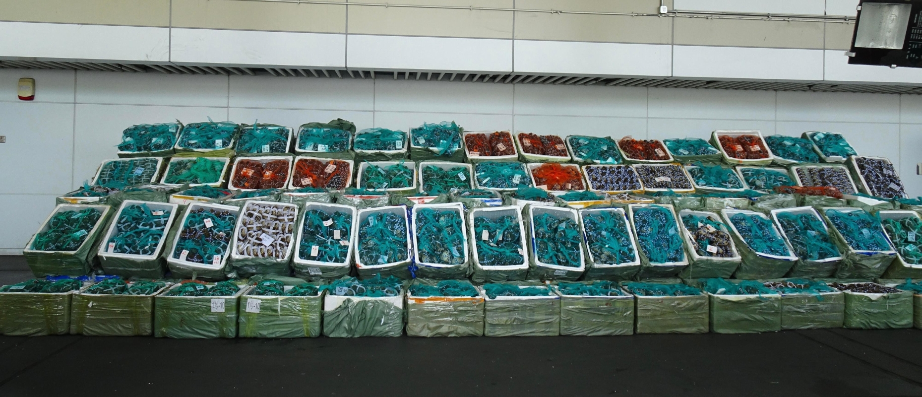(香港中通社資料圖) 與此同時,香港海關破獲有紀錄以來最大宗懷疑走私大閘蟹案件,檢獲4萬8千只大閘蟹,重10.8噸,估計市值720萬港元。涉案的57歲男司機正被扣查。 海關落馬洲貨物及車輛處理組高級督察吳偉安表示,海關10月22日在一輛報稱載有307件電子產品的入境貨車上,檢獲該批懷疑走私大閘蟹,並未符有當地出口衛生證明書,不符合香港相關規定。本次發現大閘蟹的貨車無冷凍功能,只用發泡膠箱和尼龍繩包裹大閘蟹。關員檢獲時部分大閘蟹已死亡。此外,海關近月已檢獲14宗經私家車走私的大閘蟹案件。 海關表示,聯同食物安全中心自9月1日起,在海陸空口岸展開為期3個月的聯合行動,截至10月22日已轉介41宗同類案件予食安中心跟進,當中18宗案件無證據顯示涉案批次大閘蟹有相關衛生證明書,共涉及5萬5800只大閘蟹,共重12.2噸。