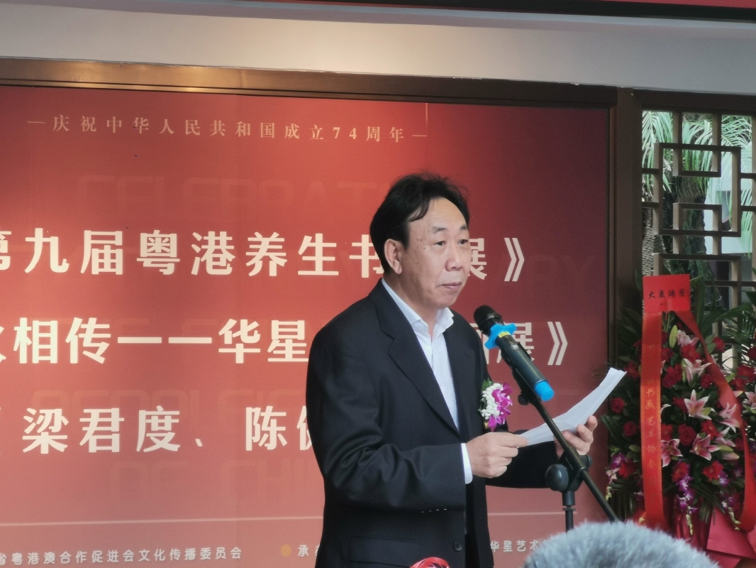 廣東省粵港澳合作促進會文化傳播委員會常務副會長張忠國致辞。 華星藝術機構是粵港書畫家的創作基地,明日書畫藝術之星的搖籃。創辦以來,耕雲種月,讓不少藝術幼苗茁壯成長。春華秋實,藉祖國母親生辰,華星藝術機構從4000多個小朋友當中,選了310多個小朋友的作品展出。小朋友的世界,是一個五彩繽紛的童話世界。通過以手寫心,孩子們將內心世界刻劃出來,那是他們心中的歌,心中的詩。透過這畫意詩情,我們可以看到孩子們的內心世界,看到他們對生活的熱愛和對美好未來的憧憬! 畫家陳健與梁君度也同期舉辦畫展,展出70多幅花鳥畫作品。他們藉中華人民共和國成立74週年之際,“裁紙染新綠,揮毫潑曉紅”,用書畫作品,讚美偉大的祖國,讚美偉大的中華民族,讚美我們更好的明天!