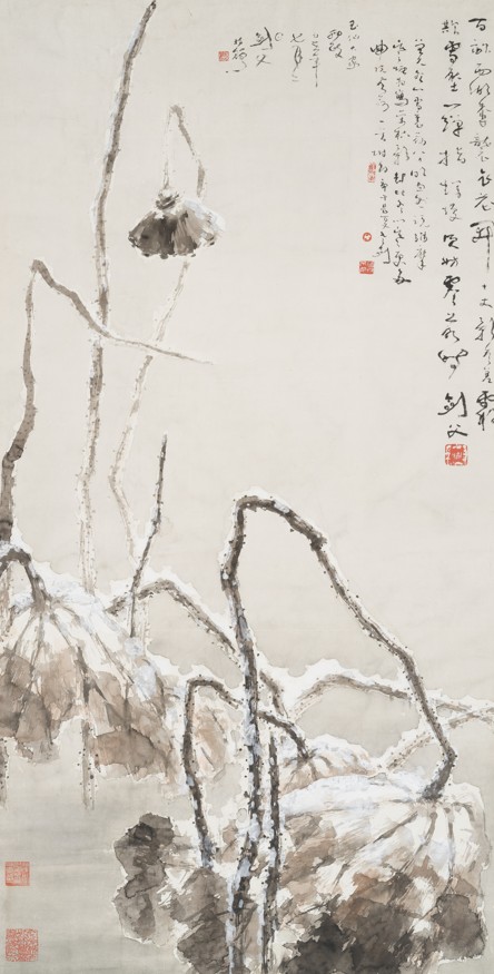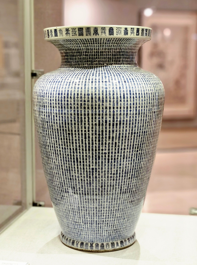 高劍父《雪裏殘荷》。(圖片:中大文物館) 其中高逾75公分的“康熙青花萬壽尊”被譽為“鎮館之寶”,據中大文物館中國器物主任(副研究員)王冠宇介紹,該尊瓶身書寫了一萬種不同書法字體的“壽”字,無論在燒製工藝還是書法寫作上都十分難得。相傳“青花萬壽尊”只在康熙時期燒製了9件,現時已發現的完整萬壽尊分布於北京故宮博物院、南京、上海等地,中大文物館亦是其一。這件雄渾巨碩的青花大尊,巍巍然有王者之風。該器外壁書有萬字,頂部兩圈,每圈77個;方唇及底足邊各48個;外口沿下尊腹至底共130圈,每圈75字,合共整1萬個。除卻一個“萬”字,其餘均為“壽”字,合成“萬壽無疆”的祝願,可見是一具吉祥之器。這些壽字共有三種大小,排列整齊,較大的形態各異,尊腹的小字則有重複,其排列、分布和寫法,自有規律可尋。中大文物館在1999年獲贈此器,時任館長林業強教授譽之為“鎮館之寶”。