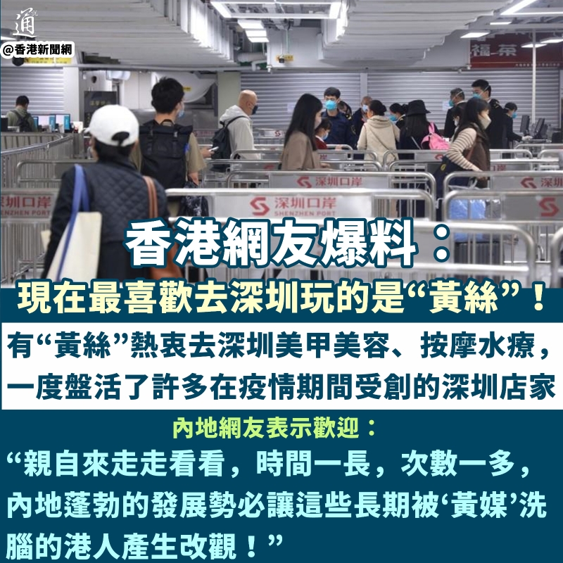 香港新聞網10月31日電 2019年香港爆發“修例風波”時,一群“黃絲”搞出了“黃色經濟圈”,用區分“黃店(支持亂港行為的店鋪)”“藍店(與“黃店”相反)”的方式來表達自己的所謂的“立場”,對來自內地的貨品更是“避之不及”。 沒想到香港與內地通關後,最喜歡北上深圳消費的竟也是這群“黃絲”…… 近日,一位化名“廢青剋星”的香港網友參與了台灣網紅“歷史哥HistoryBro”的連線,節目中,他揭露了“黃絲”偽善的嘴臉,讓大家知道了什麼是“嘴上說不要,身體很誠實”。 “廢青剋星”說,曾在“修例風波”中十分激進的“黃絲”,如今有不少加入了“深圳吃喝玩樂”的分享群組,紛紛發帖分享自己在深圳消費的感悟。 有“黃絲”抱怨自己買菜煮飯太累,不如回深圳吃一頓;有“黃絲”就算颳颱風也要去內地,直言“只要上了地鐵就不會輸,去到福田口岸就贏了”;還有“黃絲”熱衷去深圳美甲美容、按摩水療,一度盤活了許多在疫情期間受創的深圳店家……