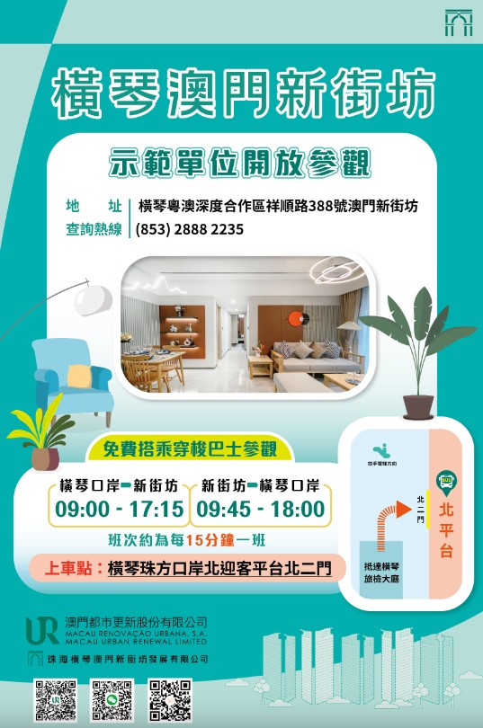 橫琴“澳門新街坊”示範單位今起開放參觀。 澳門新街坊口岸穿梭巴士15分鐘一班次 為了讓澳門居民更好地了解實地情況,澳門新街坊示範單位及樣板房(交付標準單位)今日(11月1日)起開放市民參觀,包括兩房及三房戶型,讓公眾可親身體驗用料及佈局。