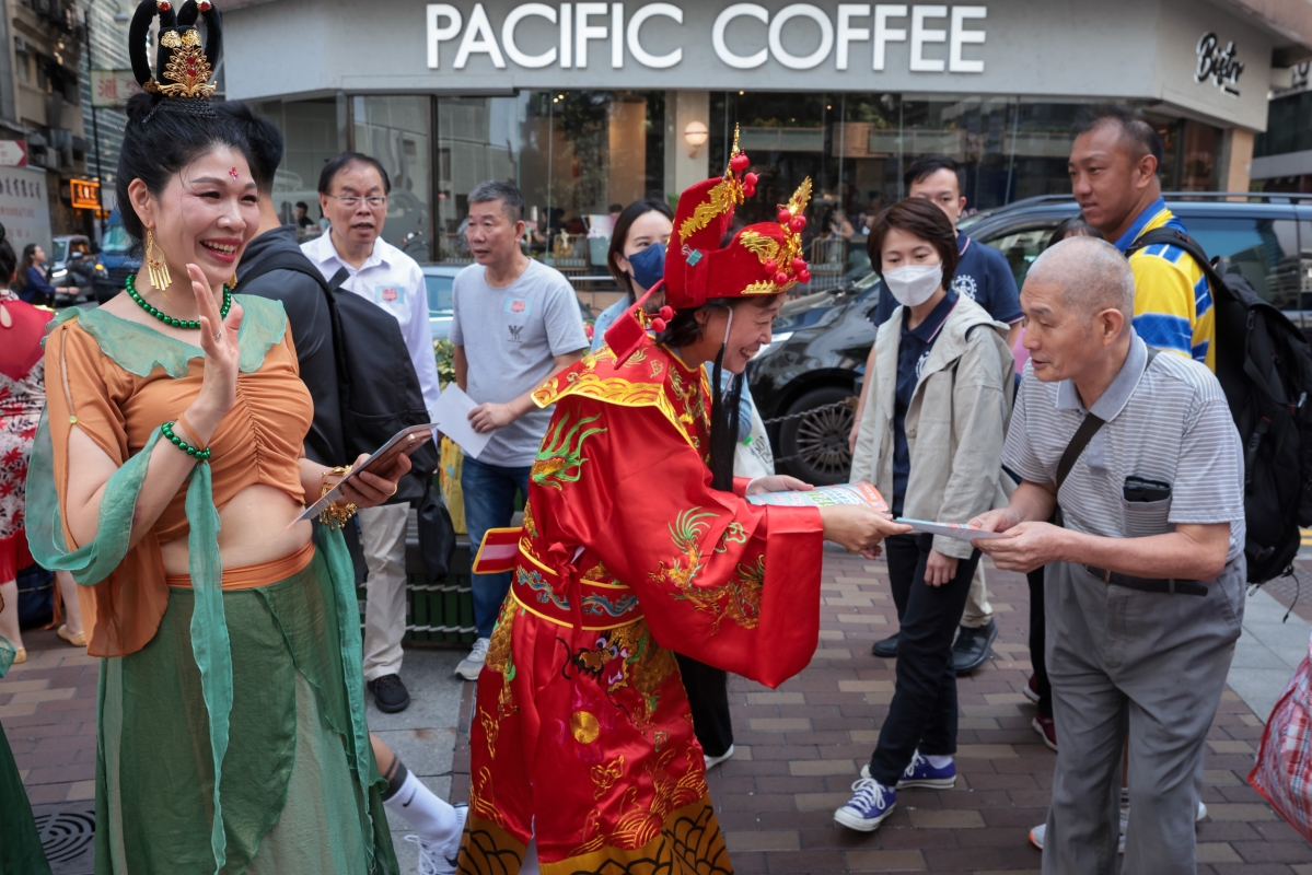 圖為志願者打扮成福祿壽、飛天等形象向市民派發區議會選舉宣傳單張。