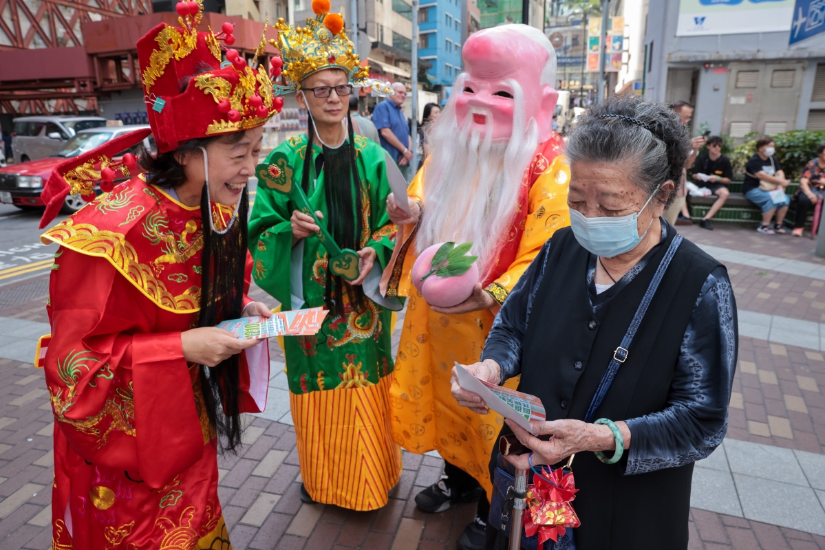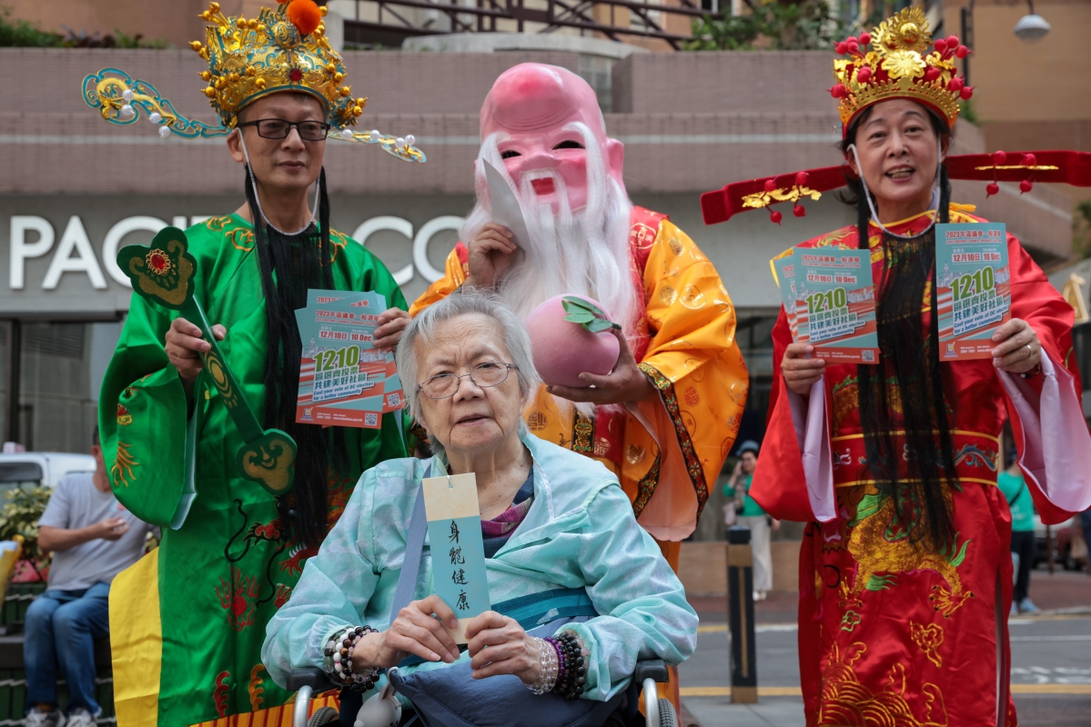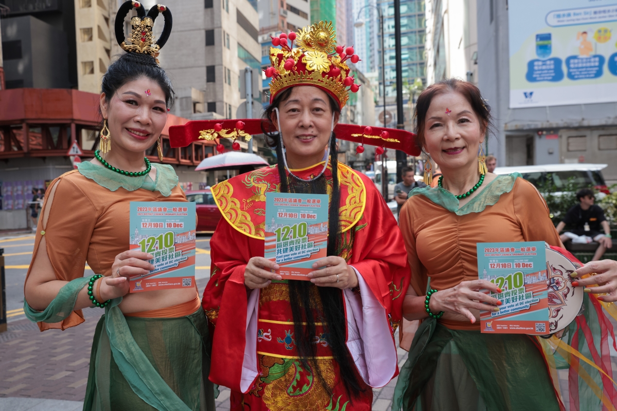 圖為志願者打扮成福祿壽等形象向市民派發區議會選舉宣傳單張。