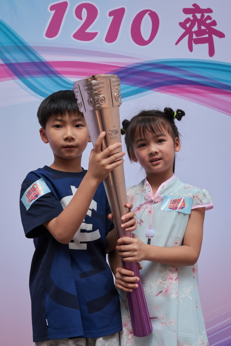 圖為小朋友與亞運火炬打卡拍照。