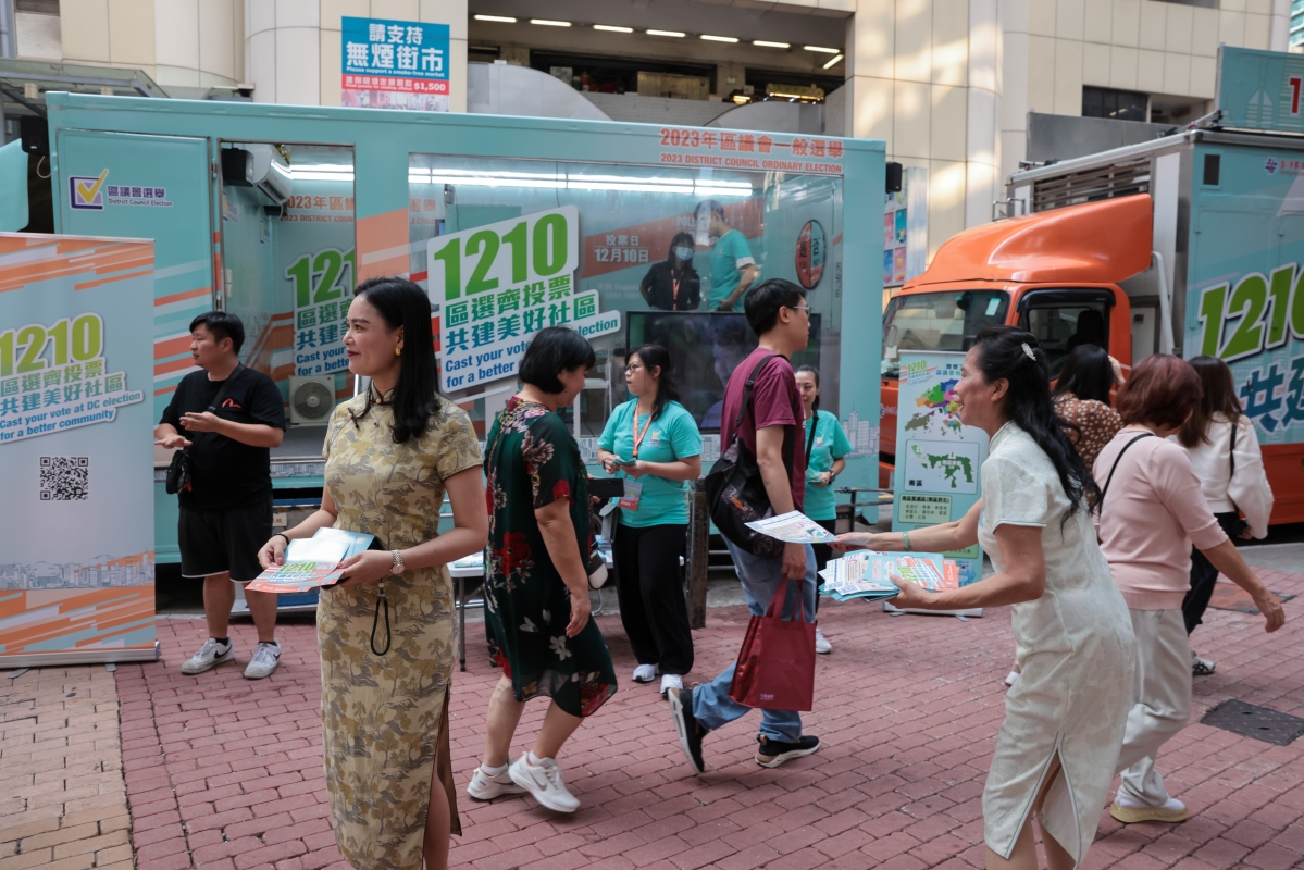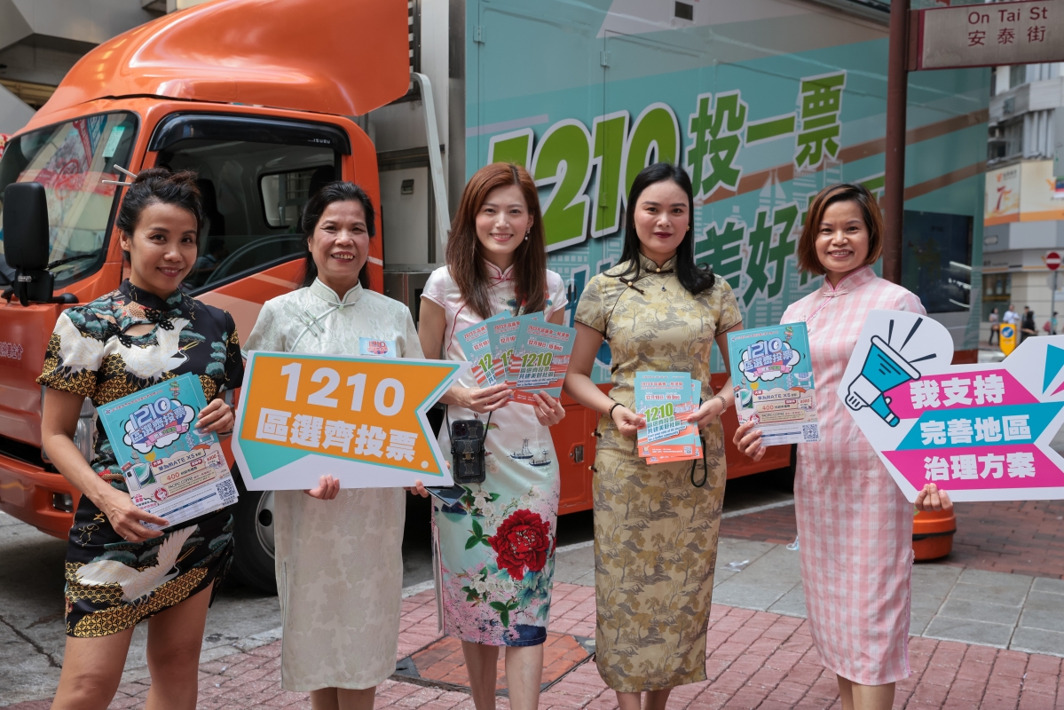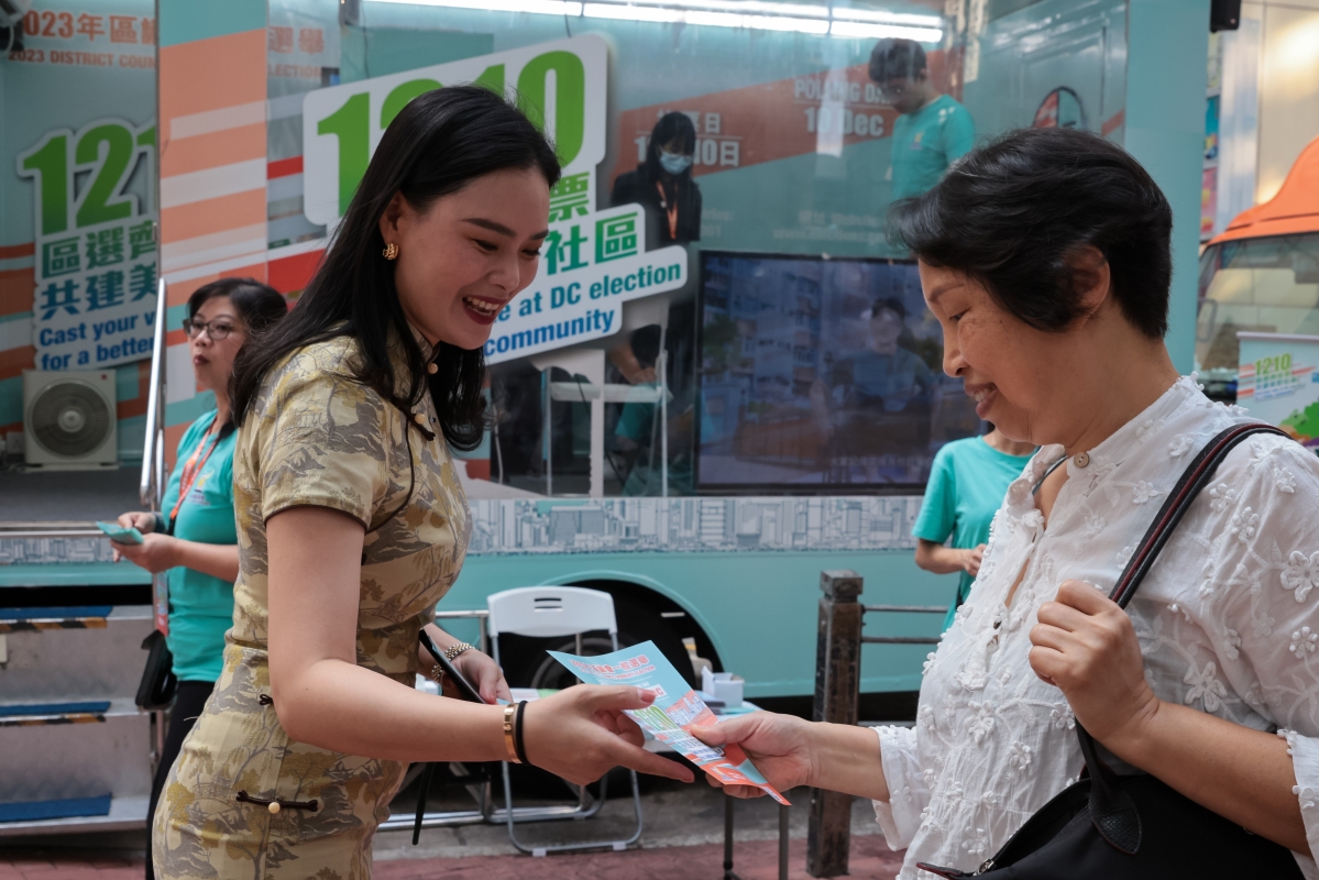 圖為志願者身穿旗袍向市民派發區議會選舉宣傳單張。