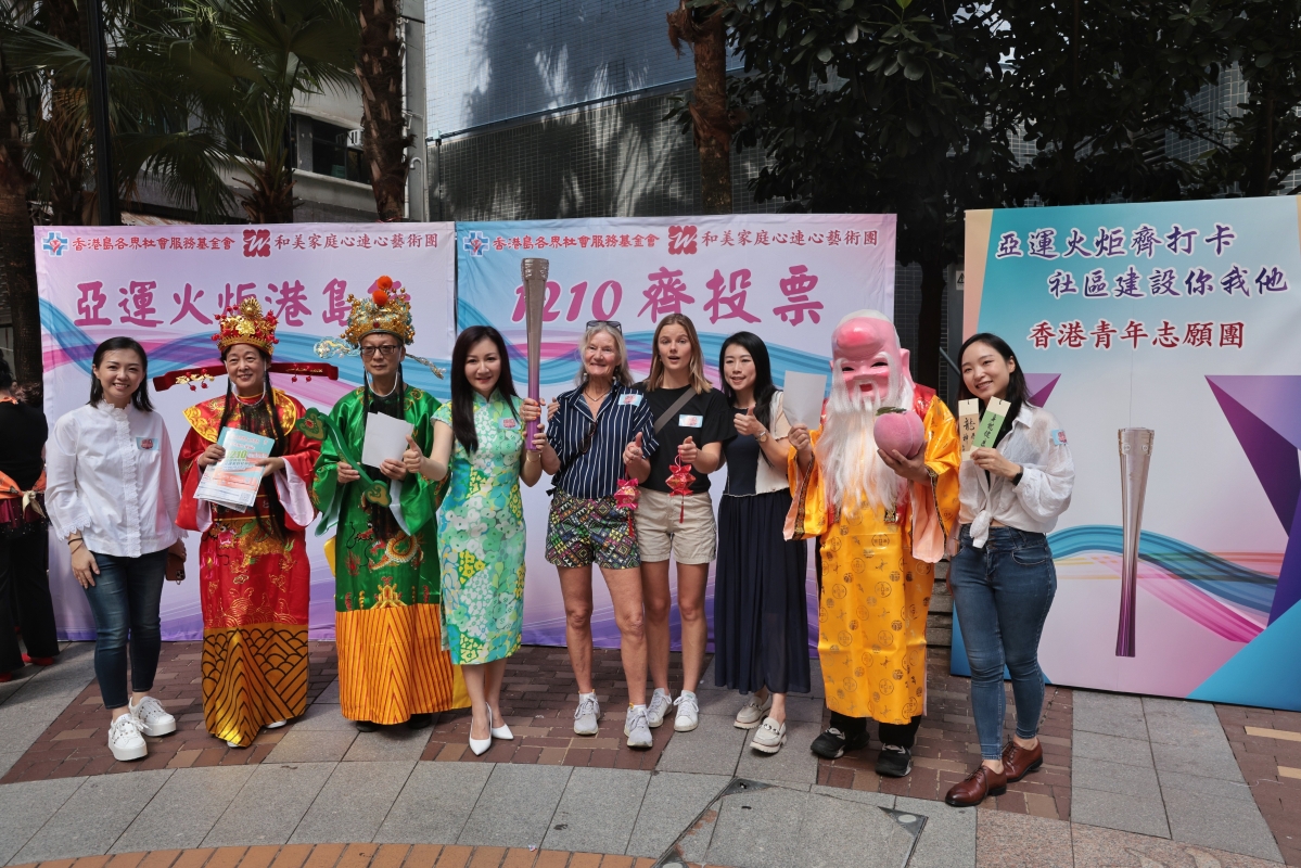 香港新聞網11月4日電(記者 謝光磊 ) 11月4日,香港島各界社會服務基金會、和美家庭心連心藝術團在上環文化廣場聯合舉辦“亞運火炬港島行 1210齊投票”活動,現場設有杭州亞運火炬打卡位,同時還有畫團扇、中華書藝等體驗攤位,區議會選舉展覽和流動宣傳車等,讓市民感受中華傳統文化魅力,同時向市民派單張,呼籲廣大市民參與12月10日區議會選舉投票,共建美好社區。