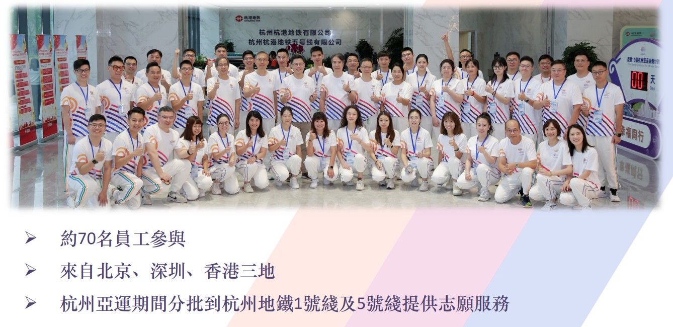 港鐵公司約70名分別來自北京、深圳、香港的員工前往杭州擔任志願者。 70名志願者當中,24人是負責香港客運服務的員工,他們分批到由港鐵合營的杭州地鐵1號綫及5號綫服務,在沿綫客流較大或鄰近亞運場館的18個重點車站協助站務工作。有志願者表示,在杭州體驗了當地車站工作,從中汲取了實戰經驗,也擴闊了視野。