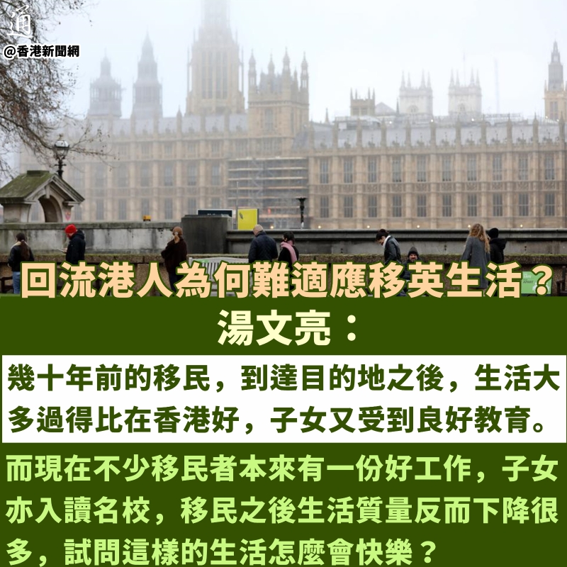 香港新聞網11月7日電 有移英港人因不適應英國生活回流香港,明明還是做回之前的工作,父母親人也都在身邊,為何不敢見朋友,還吵著要再度“移民”? 近日,香港紀惠集團副主席及行政總裁湯文亮在社交媒體臉書發文稱,自己一名老友的兒子移居英國一年半,因不適應當地生活回流香港。不過,雖然在港做的還是與之前一樣的工作,但老友兒子卻不敢見朋友,現在又打算移民加拿大。 老友說,自己當年在加拿大讀書的時候,有很多香港移民,他們教育水平不高,反而可以落地生根,他們的子女亦能夠讀大學,學有所成。不解為何近幾年的香港人,教育水平大幅提高,本身又有一份好工作,但移民之後反而不習慣,回流後也不行,兩頭不到岸。 湯文亮聽罷,感慨道,老友不明白,幾十年前的移民,到達目的地之後,生活大多過得比在香港好,子女又受到良好教育。而現在不少移民者本來有一份好工作,子女亦入讀名校,移民之後生活質量反而下降很多,試問這樣的生活怎麼會快樂?