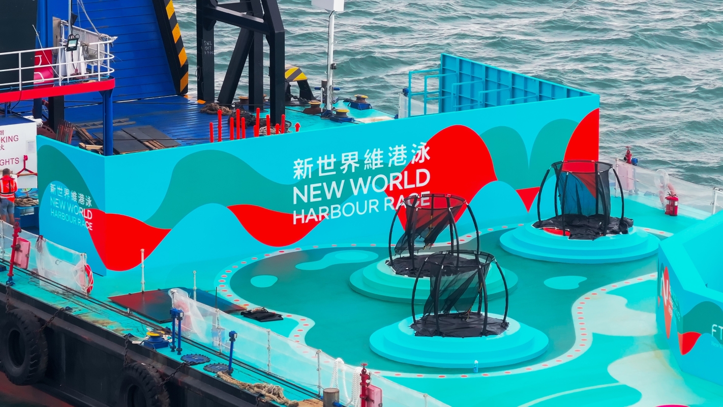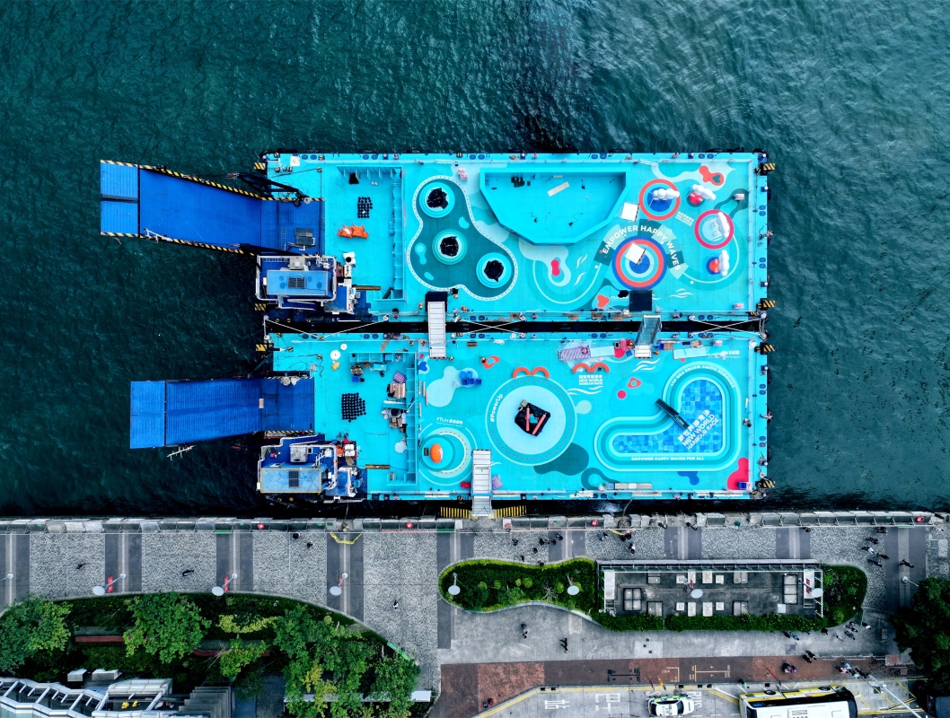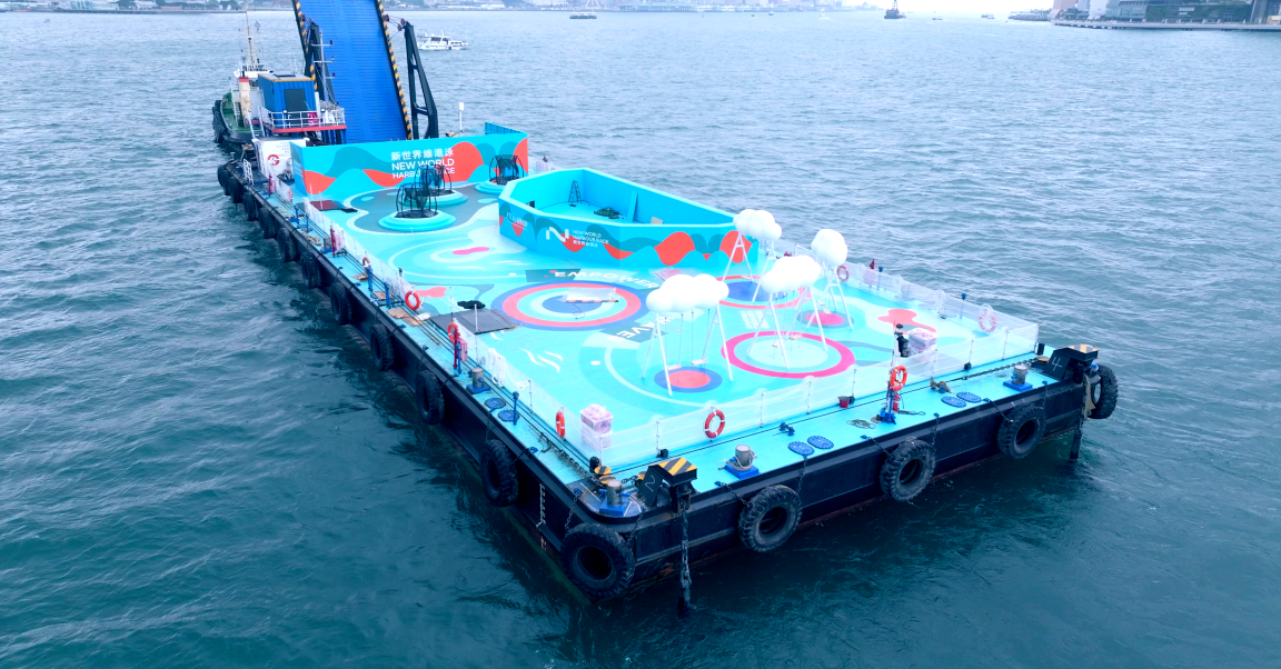現場照片可見,維港泳標誌性的巨型浮波及“無邊鞦韆”,在維港景色作為背景下,將是“打卡”熱點,讓參加者可在海上遊樂場,以嶄新維港角度拍照留念。“相躍彈床”和設有滑梯的“快樂#PowerUp‘抱抱’池”,則將可予置身維港之中的參加者盡情嬉戲耍樂。