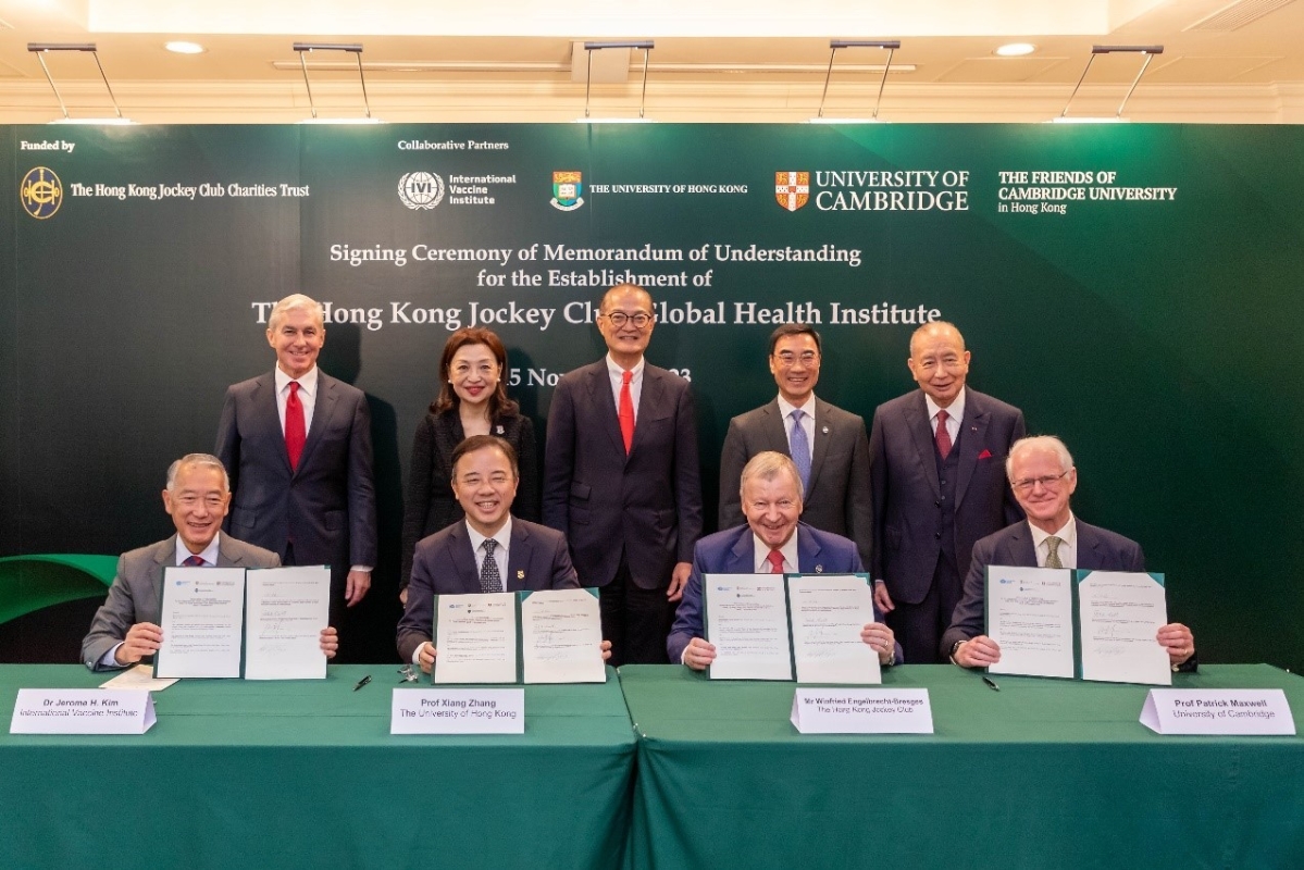 在香港特區政府醫務衞生局局長盧寵茂、馬會主席利子厚、香港大學校務委員會主席王沛詩與國際疫苗研究所理事長 George Bickerstaff等見證下,馬會行政總裁應家柏、香港大學校長張翔、劍橋大學臨床醫學院院長 Patrick Maxwell與國際疫苗研究所所長 Jerome Kim一同簽署備忘錄。 盧寵茂表示,對香港賽馬會典範式慈善工作表達衷心感謝,並指出2019冠狀病毒清晰和全面地揭示了疫苗研發和全球衞生合作至關重要,而成立“香港賽馬會環球衞生研究院”正是上述工作的重要里程碑。 利子厚表示,“香港賽馬會環球衞生研究院”由香港大學主導,並匯聚劍橋大學和國際疫苗研究所全球頂尖的科學家和研究團隊,一同進行疫苗轉發的研究。疫苗是疫情防控的最有效方案,馬會期望研究院可推進嶄新技術的應用,促進合作,讓不同產業鏈的尖端科技相互結合、融會貫通。