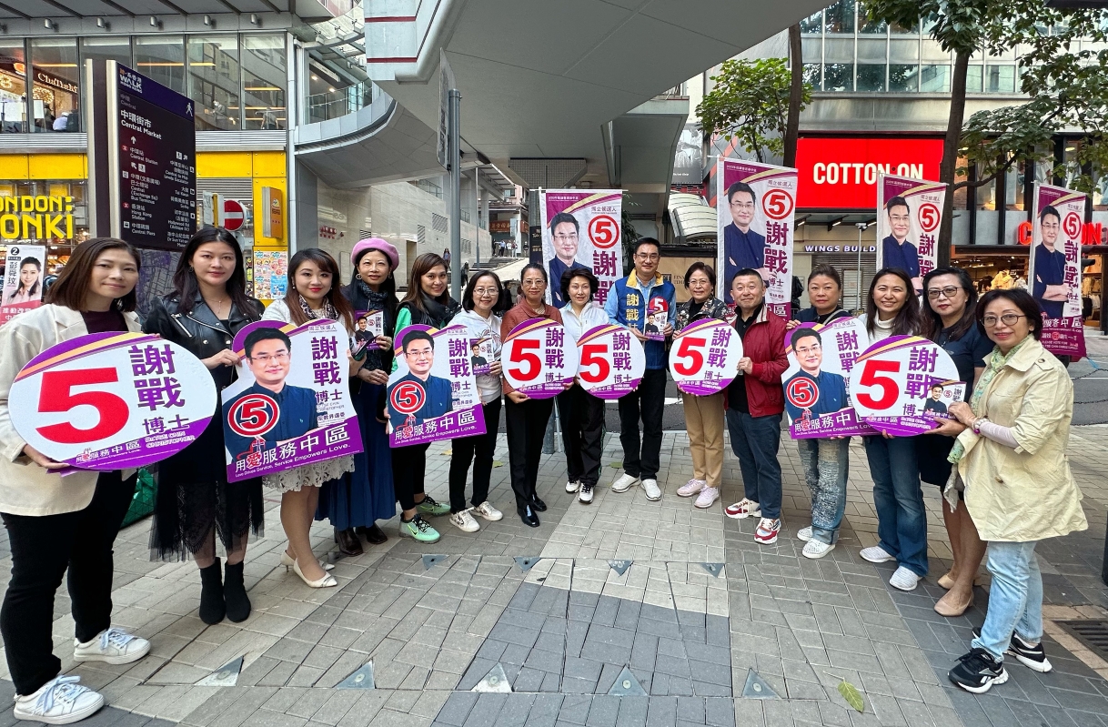 香港新聞網11月19日電  香港中華聯誼會會長鄭翔玲、全國婦代會十三大香港代表團秘書長張佐姣,與香港各界婦女代表19日下午來到中環街市街站,支持區議會選舉中區獨立侯選人謝戰博士。