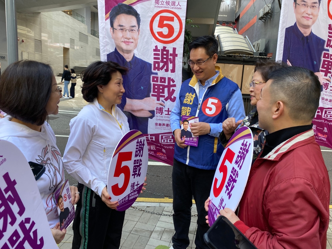 香港中華聯誼會會長鄭翔玲(左二)等支持侯選人謝戰