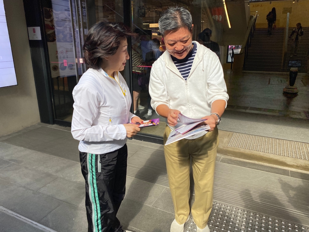 香港中華聯誼會會長鄭翔玲(左)等來到中環街市街站宣傳