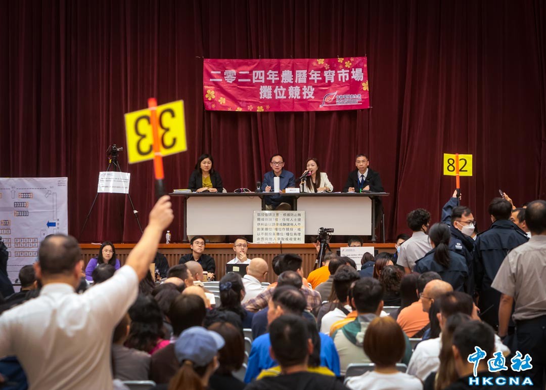 2024年維園龍年年宵市場將於明年2月4日至10日舉辦。11月13日,維園年宵市場合共387個攤位今日起一連三日進行公開競投。今次乾貨、快餐攤位自2019年後再次回歸,4個快餐攤位連同60個濕貨攤位今日率先參與競投。圖為龍年維園年宵市場攤位競投火爆。(香港中通社記者 謝光磊攝)