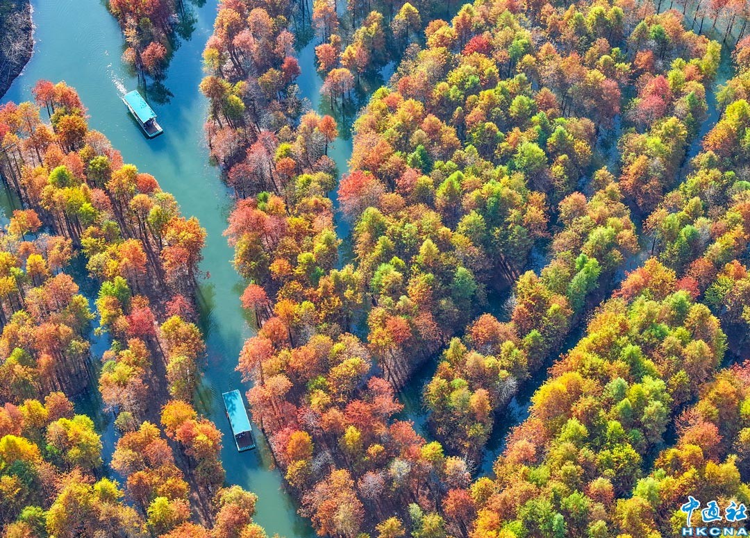11月14日,遊客乘坐竹筏在紅杉林中遊覽觀光。初冬時節,安徽省寧國市方塘鄉青龍灣濕地的紅杉林美如油畫。香港中通社圖片