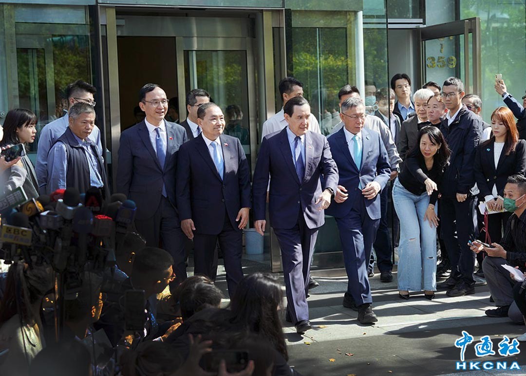 中國國民黨與台灣民眾黨第二次政黨協商15日登場,除國民黨主席朱立倫(左一)、參選人侯友宜(左二)及民眾黨主席柯文哲(右一)與會外,此次協商邀請當局前領導人馬英九(右二)到場見證。雙方最終達成合作共識,決定綜合外界民調及藍白內參民調決定大選正副手組合。 香港中通社圖片
