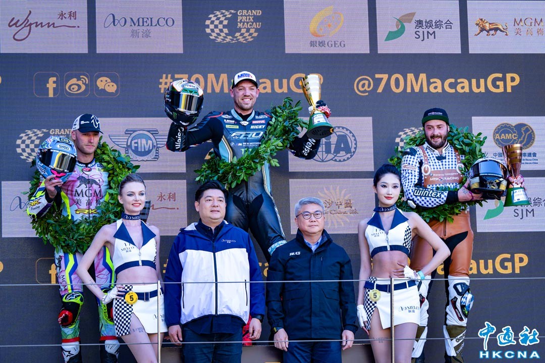 11月18日,澳門格蘭披治電單車——第五十五屆大賽頒獎禮。當日,在第70屆澳門格蘭披治大賽--澳門格蘭披治電單車——第五十五屆大賽中,英國選手赫爾文領先近30秒的成績完成12圈賽事奪冠。香港中通社圖片