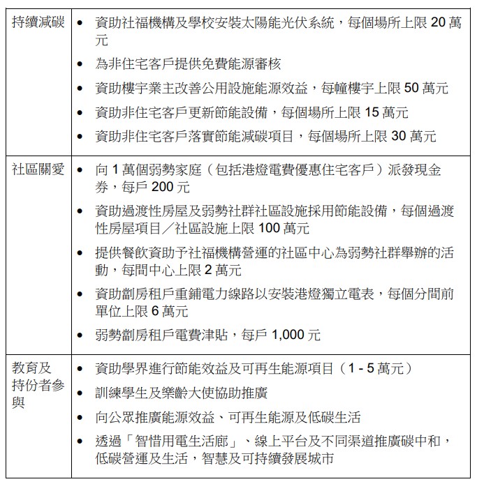 智惜用電服務2024年詳情。 港燈將於2024年推出“現金券計劃”,對象為參與港燈電費優惠計劃及有經濟困難的客戶,預料將有1萬個家庭受惠。每戶將獲發一套總值200元的現金券,以購買日常用品。 公司亦繼續為合資格的非住宅客戶提供免費能源審核,並提供每個場所最多30萬元,資助他們採用節能低碳電力設備,提升能源效益,減少碳排放及改善室內空氣質素。而每個過渡性房屋項目及協助弱勢社群的社區設施,將可獲最多100萬元資助。 另外,位處港島及南丫島的社福機構,將繼續獲得餐飲資助。每間中心舉辦對象為基層或弱勢社群的活動時,可利用資助購買餐飲,上限2萬元。港燈亦會 與社福機構合作,繼續向合資格劏房租戶提供一次性1,000元電費津貼,預計可惠及共1,200戶,亦會提供每間劏房上限15,000元或每個分間前單位6萬元,資助他們或其業主重鋪電力線路以安裝港燈獨立電表。 蔡偉民表示,為進一步減低碳排放,港燈一直從多方面著手推動可再生能源發電。由明年開始,將會為社福機構、非官立或非牟利學校,提供每個場所上限20萬元全額資助,興建太陽能光伏系統。相關機構更可參加上網電價計劃,收取上網電價。 (完) 【編輯:黃璇】