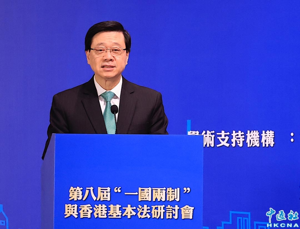 11月23日,第八屆“一國兩制”與香港基本法研討會在香港港島海逸君綽酒店舉辦。圖為香港特區行政長官李家超致辭。 (香港中通社記者 曹文毓攝)