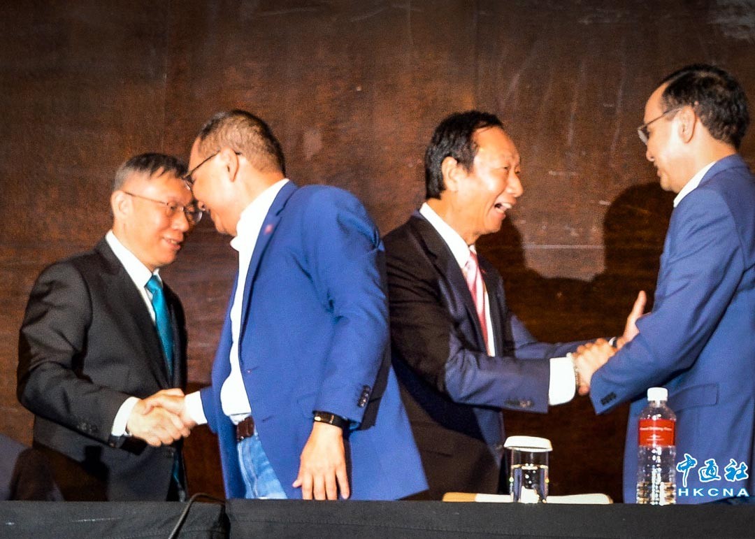 台灣2024年大選報名登記24日下午5點截止,國民黨參選人侯友宜、民眾黨參選人柯文哲及鴻海集團創辦人郭台銘23日傍晚在台北一家酒店舉行三方公開會談,謀求在最後一刻整合在野力量,下架民進黨。同場還有台灣當局前領導人馬英九及國民黨主席朱立倫。侯友宜拒絕參加閉門會議,並公開和柯文哲的簡訊,現場充滿火藥味,最終不歡而散。圖為朱立倫、郭台銘、侯友宜、柯文哲(由右至左)出席藍白合協商前互相握手致意。 香港中通社圖片