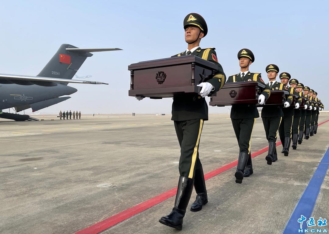 11月23日,中韓雙方在韓國仁川國際機場共同舉行在韓中國人民志願軍烈士遺骸交接儀式。圖為中國人民解放軍禮兵護送烈士棺椁。 香港中通社圖片