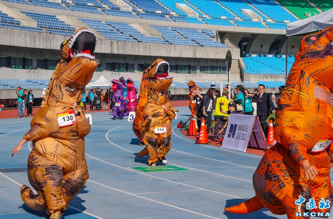台灣高雄市11月25日首度舉辦恐龍路跑趣味田徑賽,現場可見上百隻變裝恐龍在跑道上奔跑,邁開小短腿狂奔,過程搞笑又趣味,場邊則是笑聲不斷。 香港中通社圖片