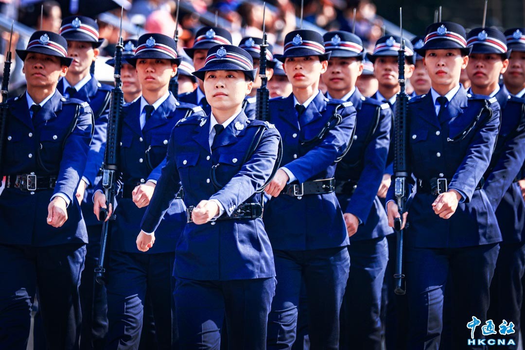 香港警察學院11月25日上午舉行結業會操,截取通訊及監察事務專員楊振權在典禮中檢閱畢業的見習督察和學警。(香港中通社記者 許其皓攝)