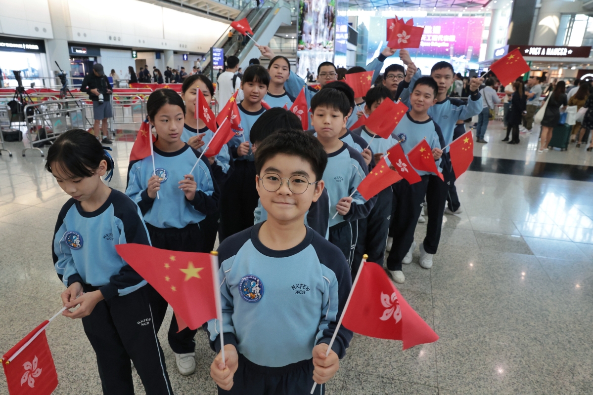 來自教聯會黃楚標學校的小學生們在接機大堂揮動國旗及區旗歡迎代表團來訪。 【編輯:謝光磊】