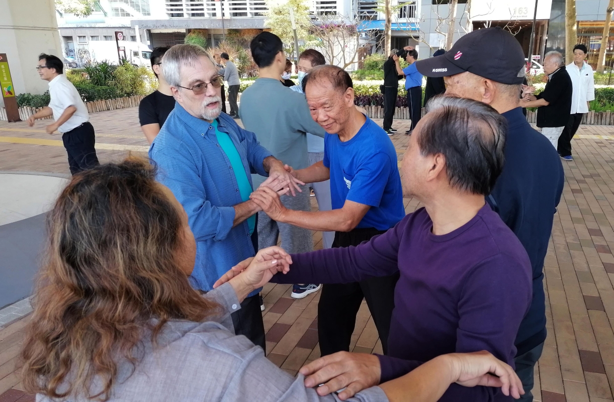 香港新聞網12月7日電(記者洪少葵) 12月7日清晨,在香港觀塘海濱公園練習的一群太極拳、武術愛好者,各展其技,場面熱鬧。當天,來自紐約的拳友正和太極師傅們切磋推手,樂也融融。早前,在各方努力推廣下,海濱公園廣場增加了大型太極元素的圖案,更加充分展示中華武術文化,成為武術愛好者和與世界各地拳友交流的地標。 逢星期四定期於觀塘海濱公園舉行的太極養身推手聚會,近年來,吸引眾多志同道合的各種流派武術、太極拳愛好者前來交流分享。“觀塘海濱太極推手會”早年在施雄鵬、尤贊成、何成等師傅組織帶領下,一班太極愛好者,定期在觀塘海濱聚會交流所學,慢慢這個聚會名聞遐邇,吸引了更多太極愛好者來,到現在已有大約一百位聚會成員。聚會除了交流心得外,還邀請太極名師到場指點外,主要切磋以推手為主,傳播養身正能量。 中華傳統武術太極拳,既是武功,又是保健體育,深受民眾認可與健身愛好者的喜歡,如今,遍覽大江南北乃至國際,學習太極之人有增無減。“觀塘海濱太極推手會”的師傅們將繼續將太極拳文化發揚光大,一代一代將中國傳統文化太極拳傳播下去。
