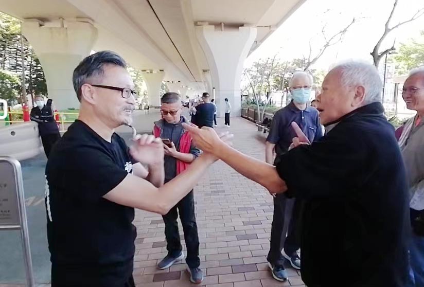 香港資深演員詠春師傅徐廣林(右)與鐘文達師傅在練習
