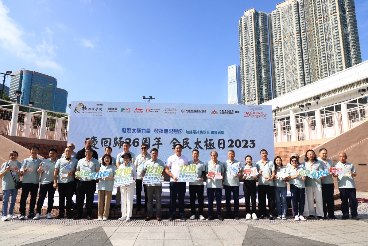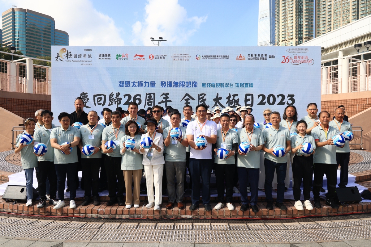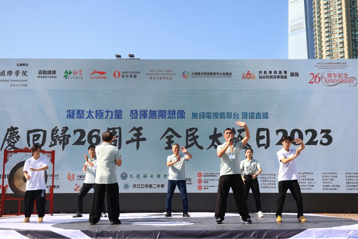 香港新聞網12月9日電(記者 許其皓)12月9日,香港“全民太極日2023”在九龍公園舉行。當天,大會首次邀請武當山、與大灣區城市台山聯合同時舉行,並由無綫電視翡翠台現場直播。香港特區行政長官李家超於線上致辭。商務及經濟發展局局長丘應樺、發展局局長甯漢豪、民政及青年事務局副局長梁宏正、香港立法會議員、太極大使霍啟剛、“全民太極日”籌委會主席陳婉嫻、太極國際學院總監貝鈞奇、太極國際學院主席林文輝等眾多嘉賓及太極拳愛好者出席。大會透露“全民太極日”明年會在大灣區推行,第三年會向全世界推行,香港中西文化匯聚,對把太極推廣到全世界有很大幫助。 在現場指導的太極國際學院主席林文輝示範推介的太極四式:“玉女穿梭”、“倒卷肱”、“摟膝拗步”、“雲手”。 他說,太極是中國悠久優秀文化的表表者,與時并進,大會除拍攝了教學視頻放上網,更創建了“元宇宙太極教室”,讓年青一代體會民族精神。 同場參與“耍太極”的還有來自內地和世界各地的太極拳愛好者。