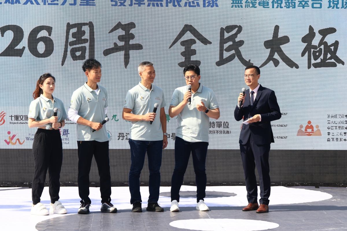 太極大使霍啟剛(右二)、姚柏良(中)、敖嘉年(左二)、莫宛螢(左一)分享太極對強身健體的益處