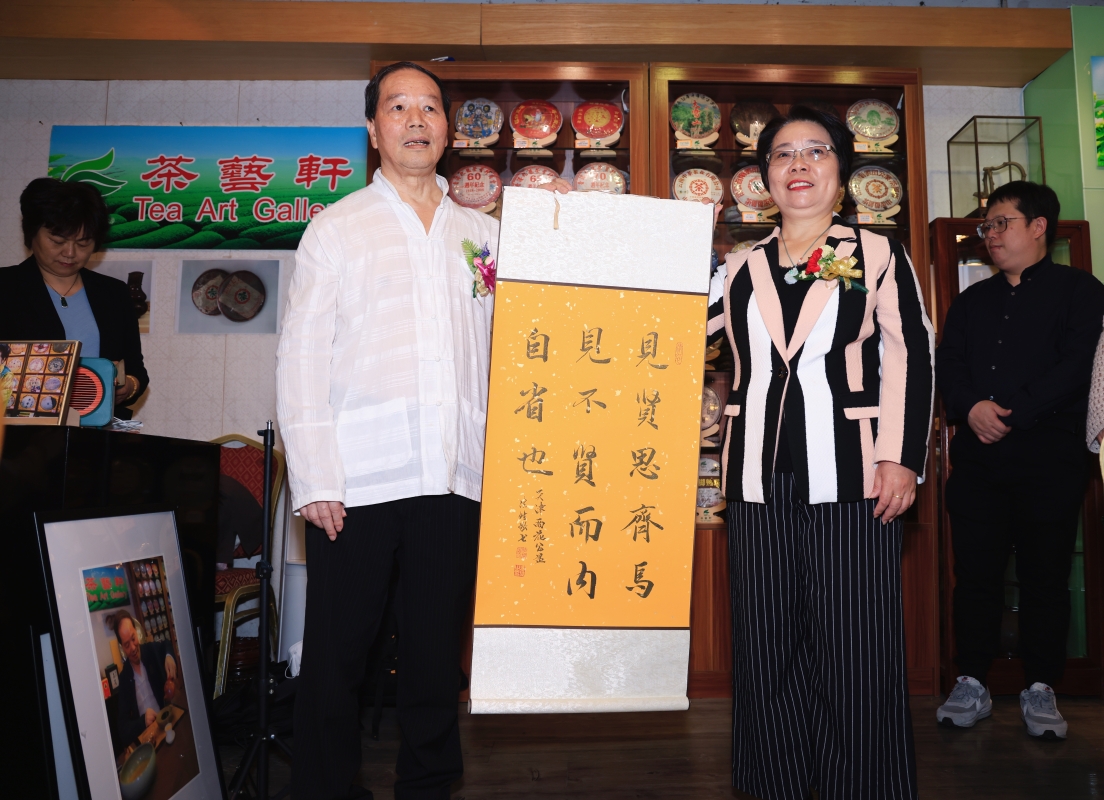 香港盛大投資集團林梅香董事長(右)贈送字畫給茶藝軒展覽活動