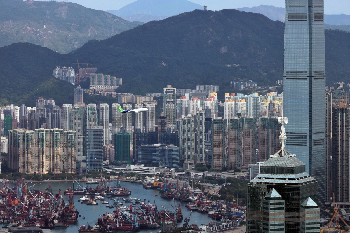 C919由西至東進入及飛越維港上空,并環繞香港島兩圈