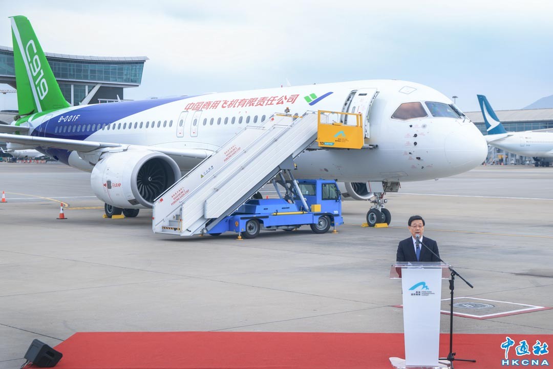國家自主研製的C919及ARJ21飛機日前首次到訪香港。12月13日,民航處及機場管理局在香港國際機場停機坪為兩架飛機舉行歡迎儀式。圖為香港特區行政長官李家超致辭。(香港中通社記者 許其皓攝)