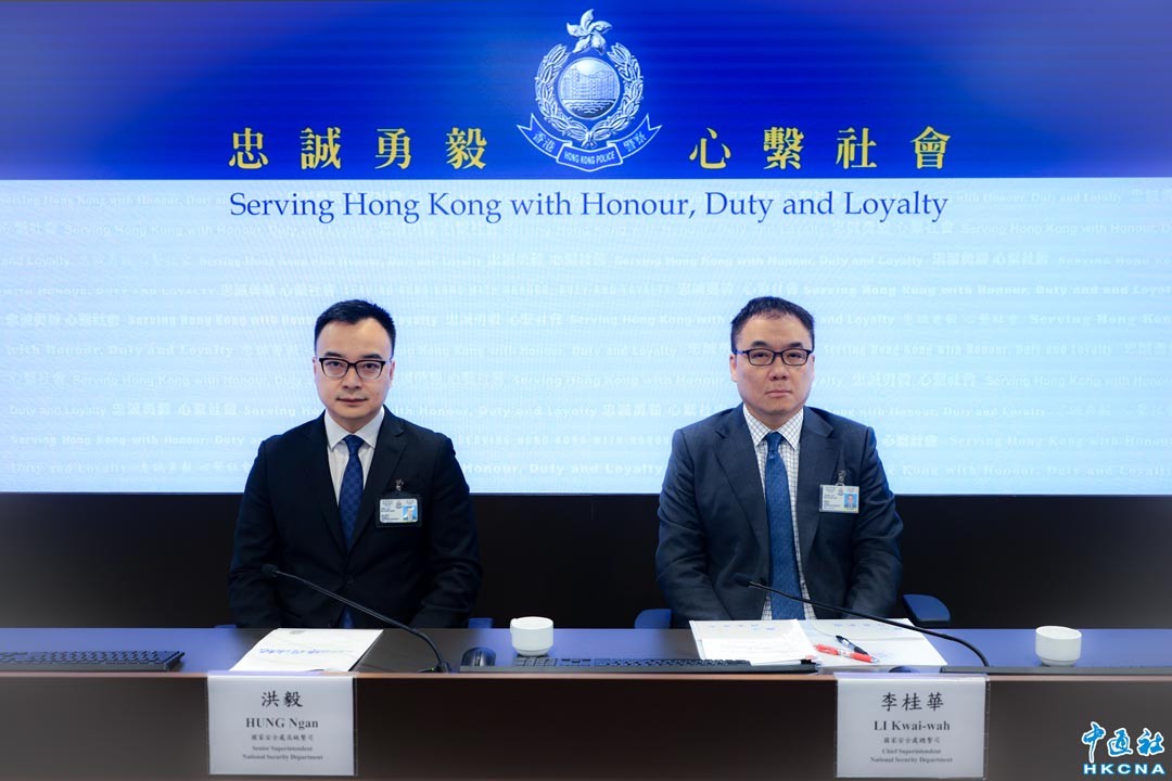 香港警務處國家安全處12月14日舉行記者會公布新一批通緝名單,涉及5名現正身處海外的人士,5人分別是鄭文傑、許穎婷、邵嵐、霍嘉誌及蔡明達,每人懸紅100萬元。圖為香港警務處國家安全處總警司李桂華(右)及香港警務處國家安全處高級警司洪毅(左)出席記者會。(香港中通社記者 許其皓攝)