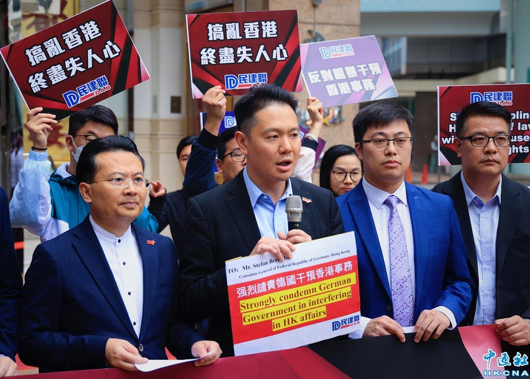 12月14日,香港民建聯在德國駐香港總領事館抗議德國政府干預香港事務。圖為香港立法會議員周浩鼎(左二)、香港民建聯副主席陳勇(左一)。 (香港中通社記者 曹文毓攝)