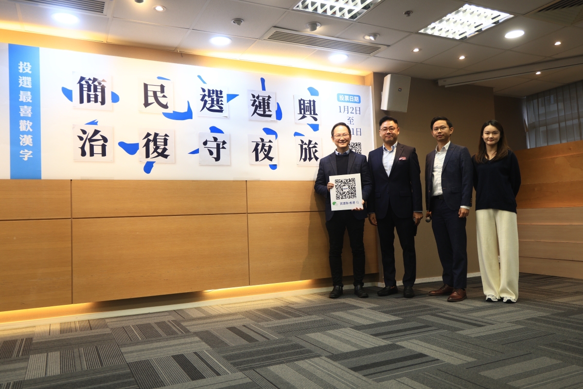 民建聯副主席陳學鋒(左起)、民建聯秘書長葉傲冬、候任沙田區議員陳壇丹、候任西貢區議員施彬彬舉行記者會公佈十個候選漢字及活動的相關安排。 【編輯:許其皓】