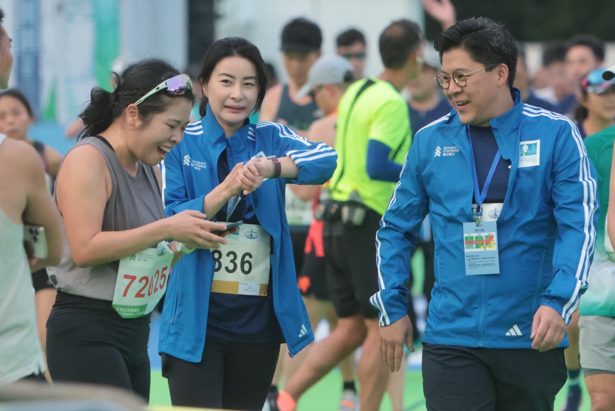香港立法會議員霍啟剛(右)與其太太郭晶晶攜手衝過終點線,不少跑手爭相與他們合影