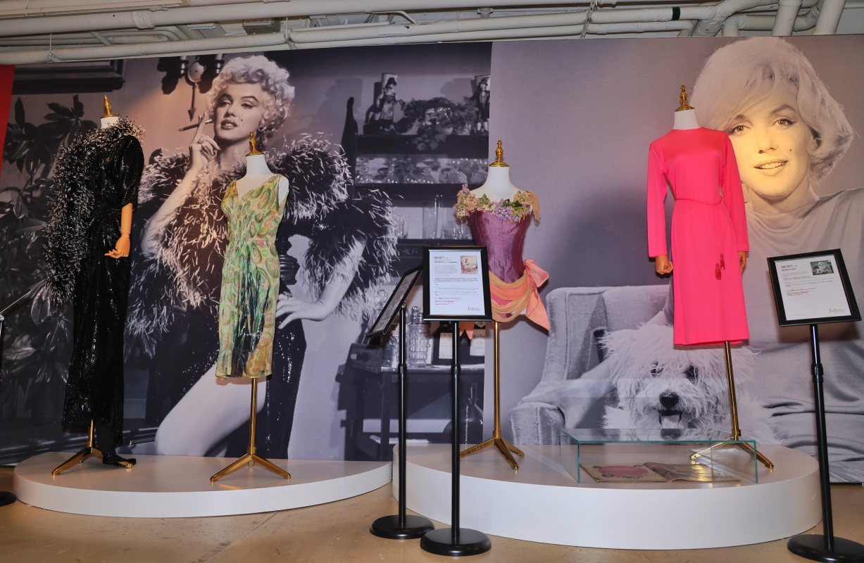 展覽帶來四套瑪麗蓮·夢露曾穿著的衣裙,包括於1955年經典電影《七年之癢》中所穿的黑色玻璃紙效果晚禮服,由傳奇服裝設計師威廉·特拉維拉(William Travilla)設計,風格靈感源自梅·蕙絲(Mae West)(左一);粉紅色 Pucci 絲質針織長袖連衣裙(右一)。