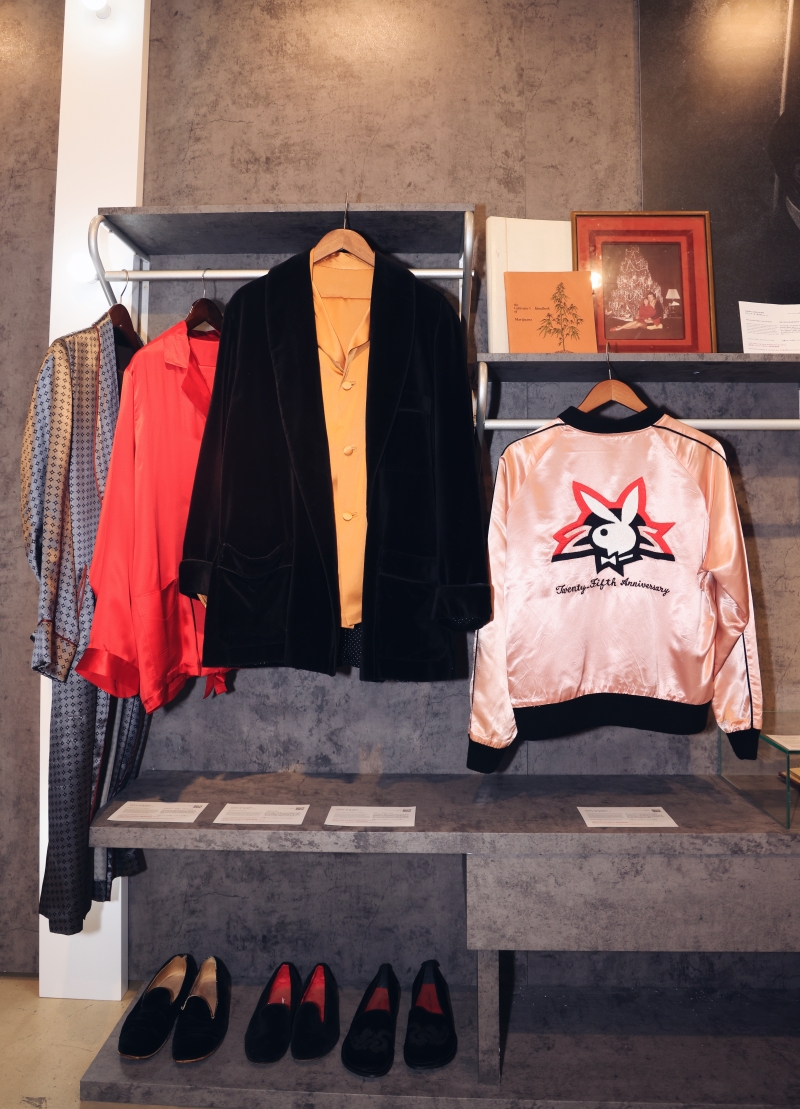 休·海夫納的經典吸煙夾克、絲綢睡衣及拖鞋(右二);花花公子 25 週年紀念粉紅色 飛行員夾克及牌匾(右一)