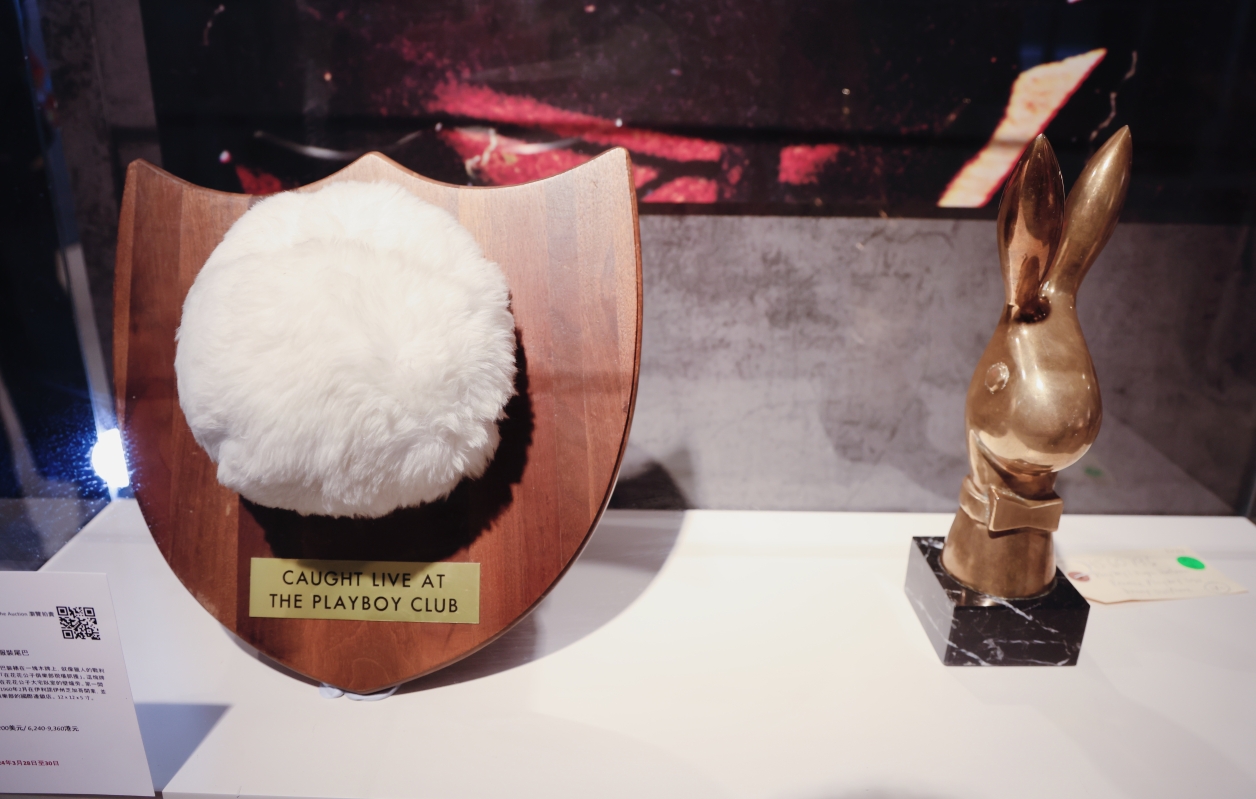 圖為青銅花花公子標誌兔子雕塑(右)、裝裱花花公子兔子服裝尾巴(左)。