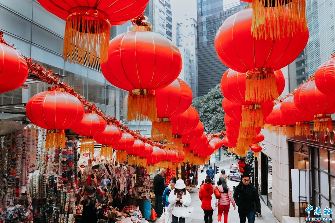 臨近農曆新年,香港中環石板街一派喜氣洋洋,大紅燈籠高掛,賀年裝飾登場營造節日氣氛。(香港中通社記者 洪少葵攝)