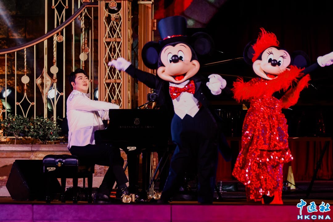 1月27日, 世界知名鋼琴家郎朗(左一)首次踏上香港迪士尼樂園奇妙夢想城堡舞台,與客席指揮趙增熹,以及弦樂四重奏樂團攜手合作,配合令人嘆為觀止的舞台視覺特效,為觀眾獻上了扣人心弦的45分鐘現場演奏。(香港中通社記者 許其皓攝)