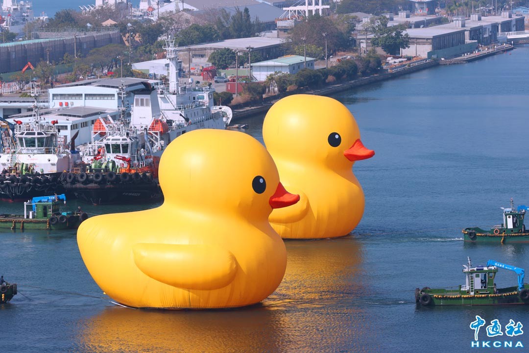 睽違10年,高達18公尺高的超大黃色小鴨,1月27日起重返高雄愛河灣,現場吸引上萬名民眾一睹小鴨遨遊畫面。這次以“雙鴨”登場,代表要帶來加倍的歡樂,許多遊客帶著小鴨的應援小物,趕在開幕當天就來朝聖,兩隻巨大充氣小鴨緩緩入港,場面相當壯觀。香港中通社圖片