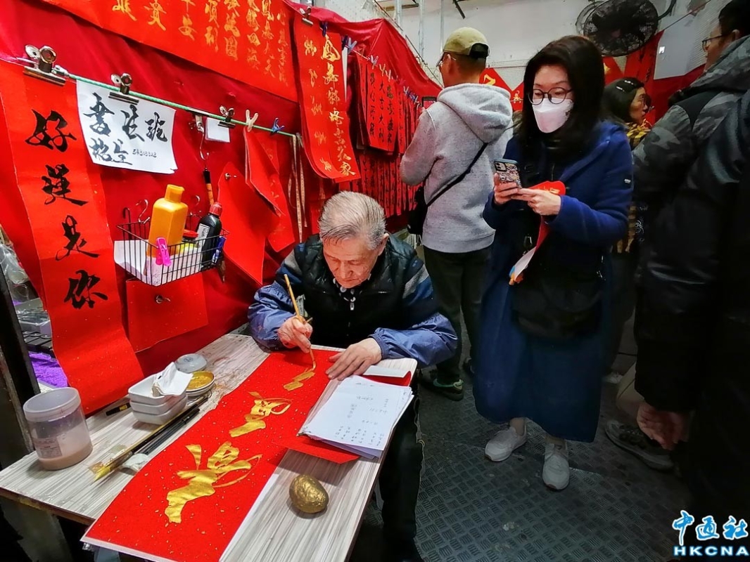 1月28日,香港街头書寫春聯的攤位吸引市民驻足欣賞。臨近農曆新年,喜氣洋洋的賀年彩飾和春聯深受欢迎。(香港中通社記者 洪少葵攝)
