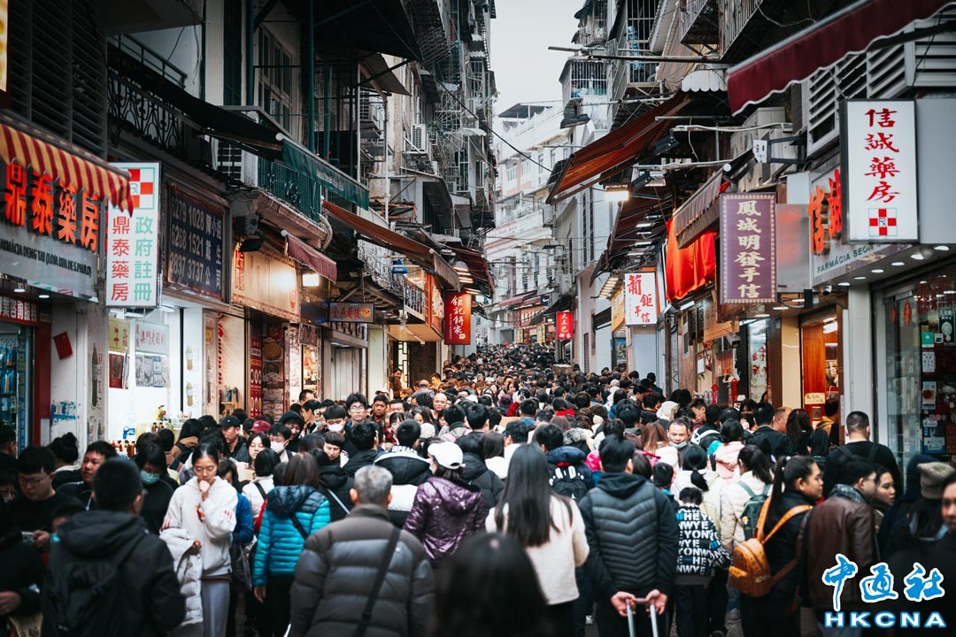 臨近農曆新年,澳門新馬路、大三巴等旅遊景區人頭攢動。香港中通社圖片